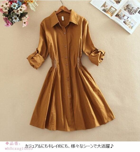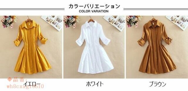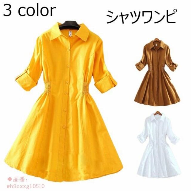 シャツワンピ レディース ワンピース 無地 ウエストゴム 膝丈 ミモレ丈 7分袖 カジュアル 春 夏 秋 2019春新作