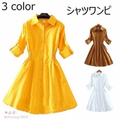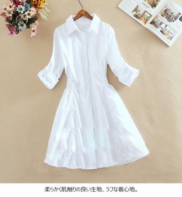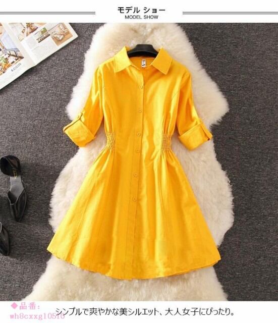 シャツワンピ レディース ワンピース ウエストゴム 無地 2019春新作 夏 膝丈 春 秋 カジュアル ミモレ丈 7分袖
