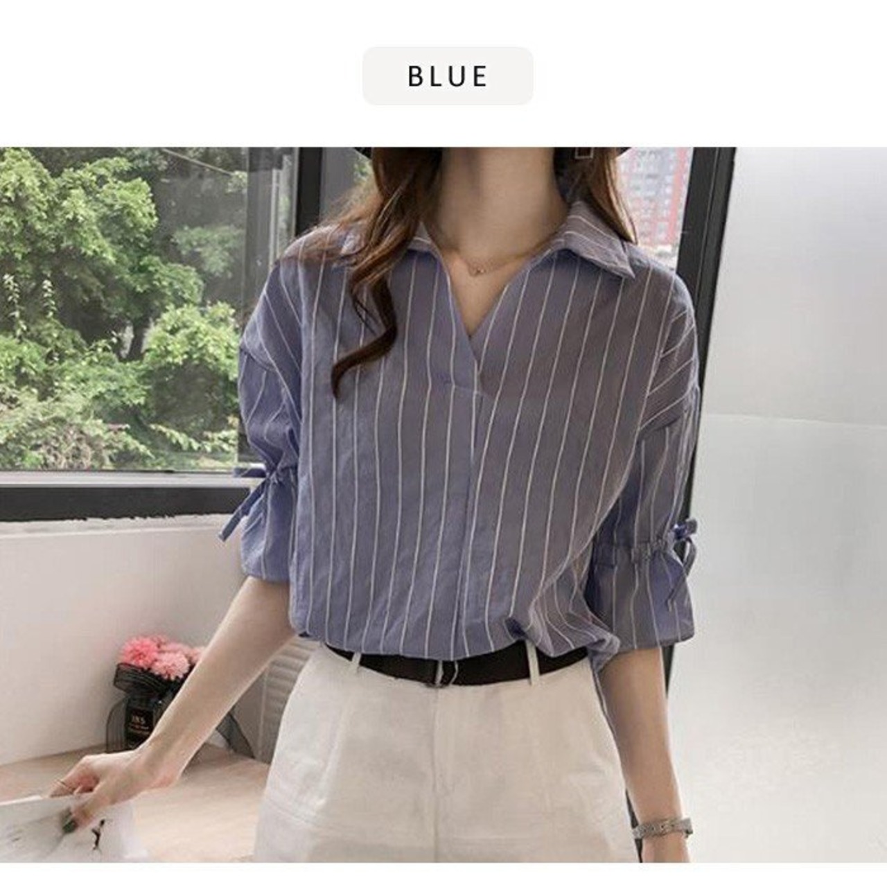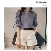 リボン袖ストライプ スキッパーシャツ