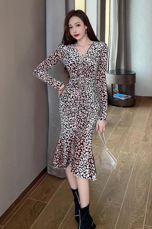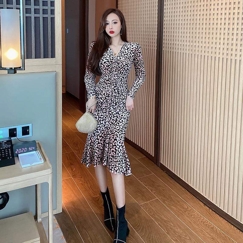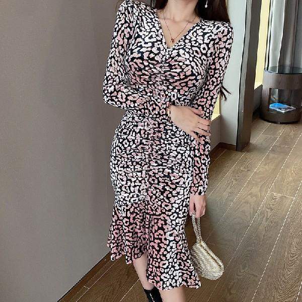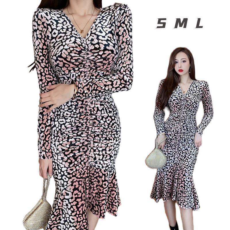 長袖 ヒョウ柄 ひざ丈ワンピース Vネック マーメイドスカート タックワンピース チュニックワンピース ハイウエストスカート タイトスカート イベント | funitem