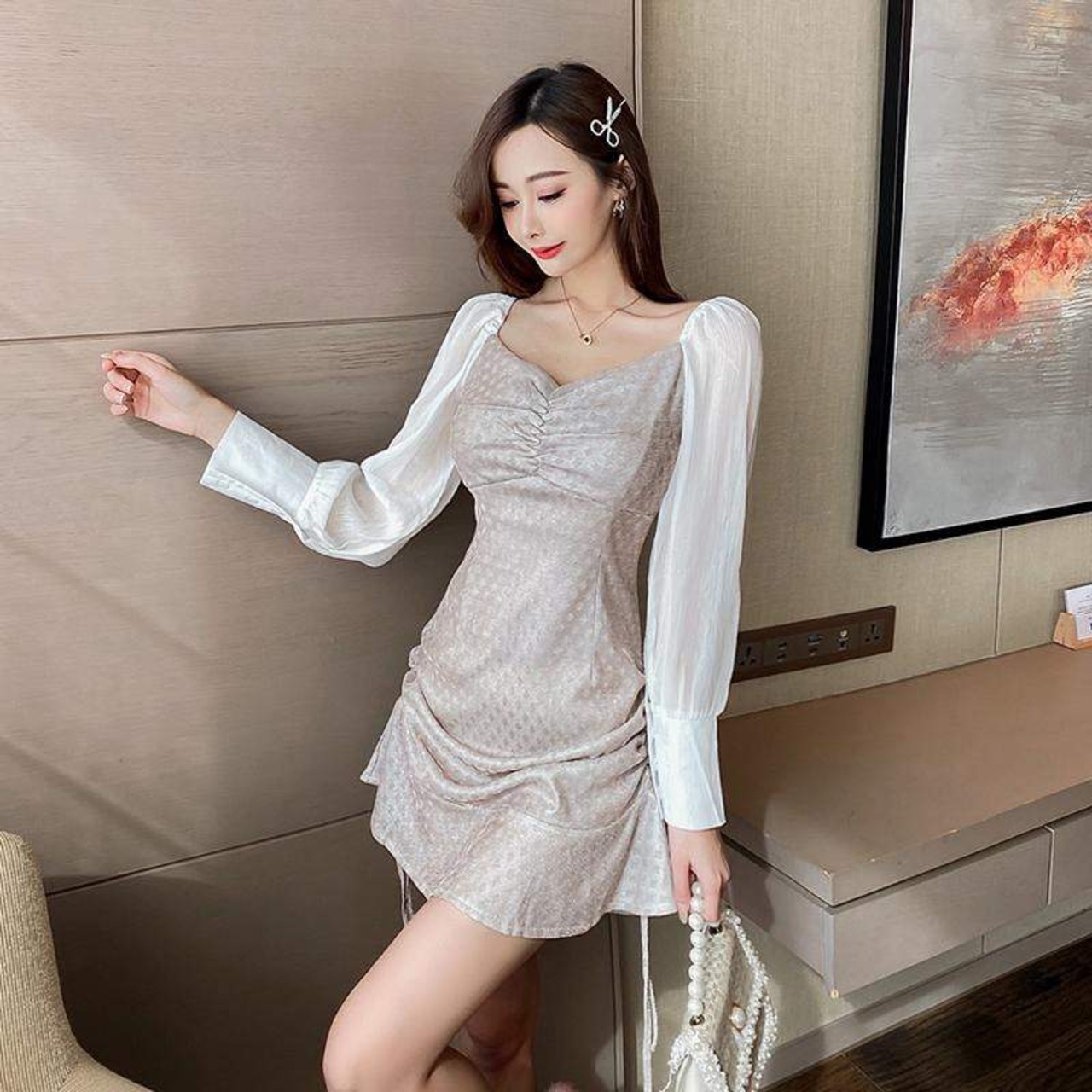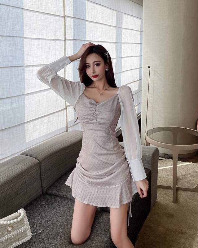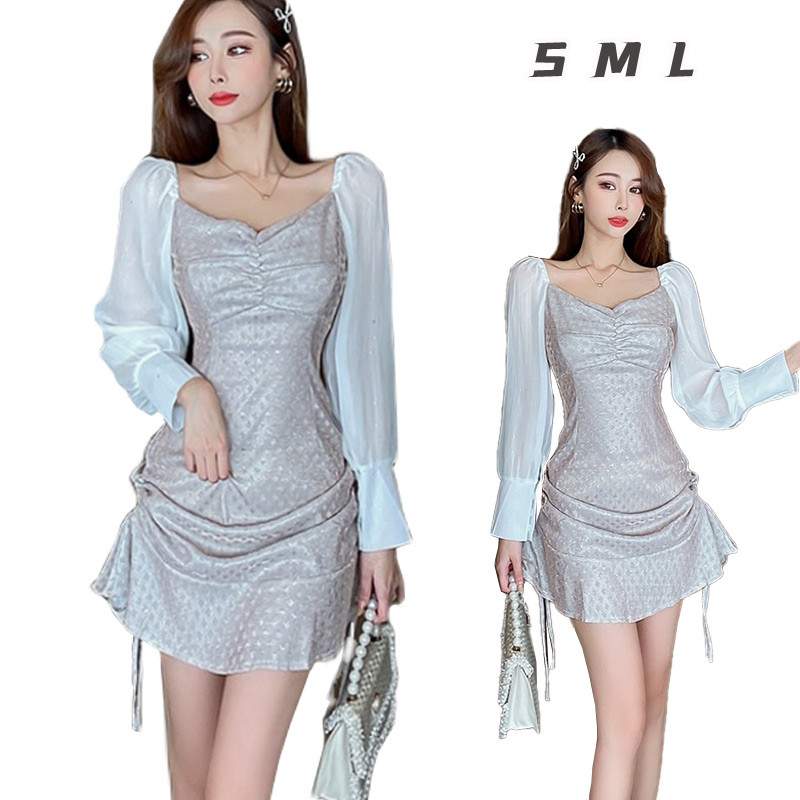 長袖 水玉ワンピース タックワンピース ショート丈 ワンピース チュニックワンピース ミニスカート ハイウエストスカート Aラインワンピース オフネック | funitem