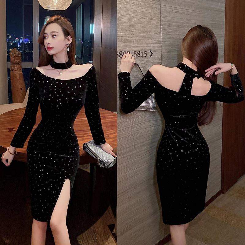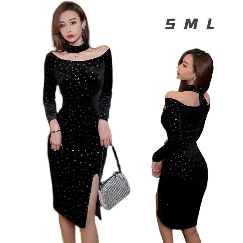 新作 無地 スリット ワンピース スリット ワンピース スリット ワンピース ボートネック ペンシルスカート長袖 フェミニンな色 通勤 披露宴 新作