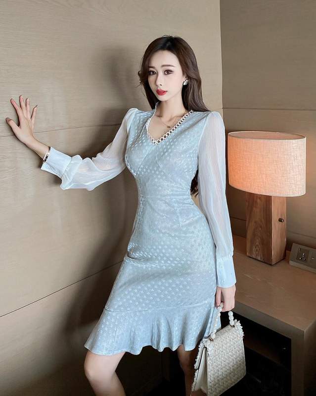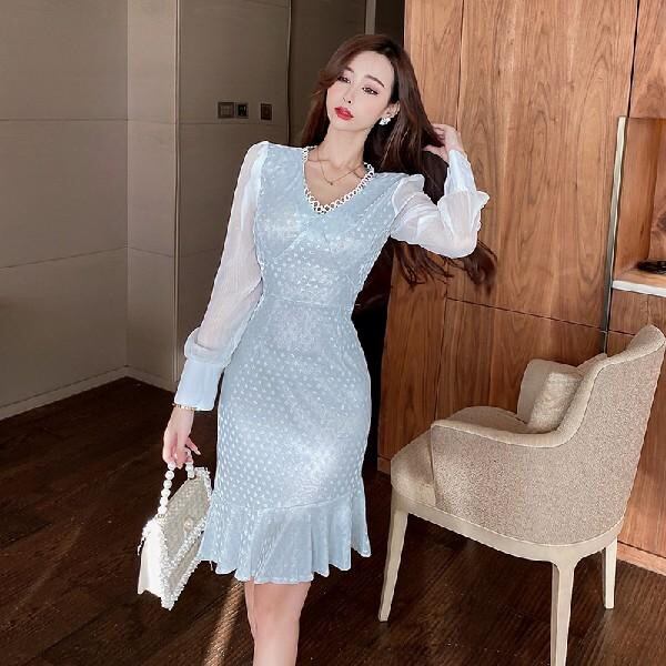 新作 水玉ワンピース タイトスカート マーメイドスカート ラッフルスカート Vネック ひざ丈ワンピース ドッキングワンピ フェミニンな色 ワンピース 華麗 通勤 | funitem